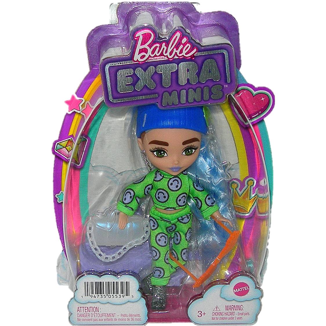 This Barbie Extra Minis doll rocks an extra-long, pastel-blue hairstyle with a shaved side, a 2-piece matching sweatsuit with smiley face print and black booties.